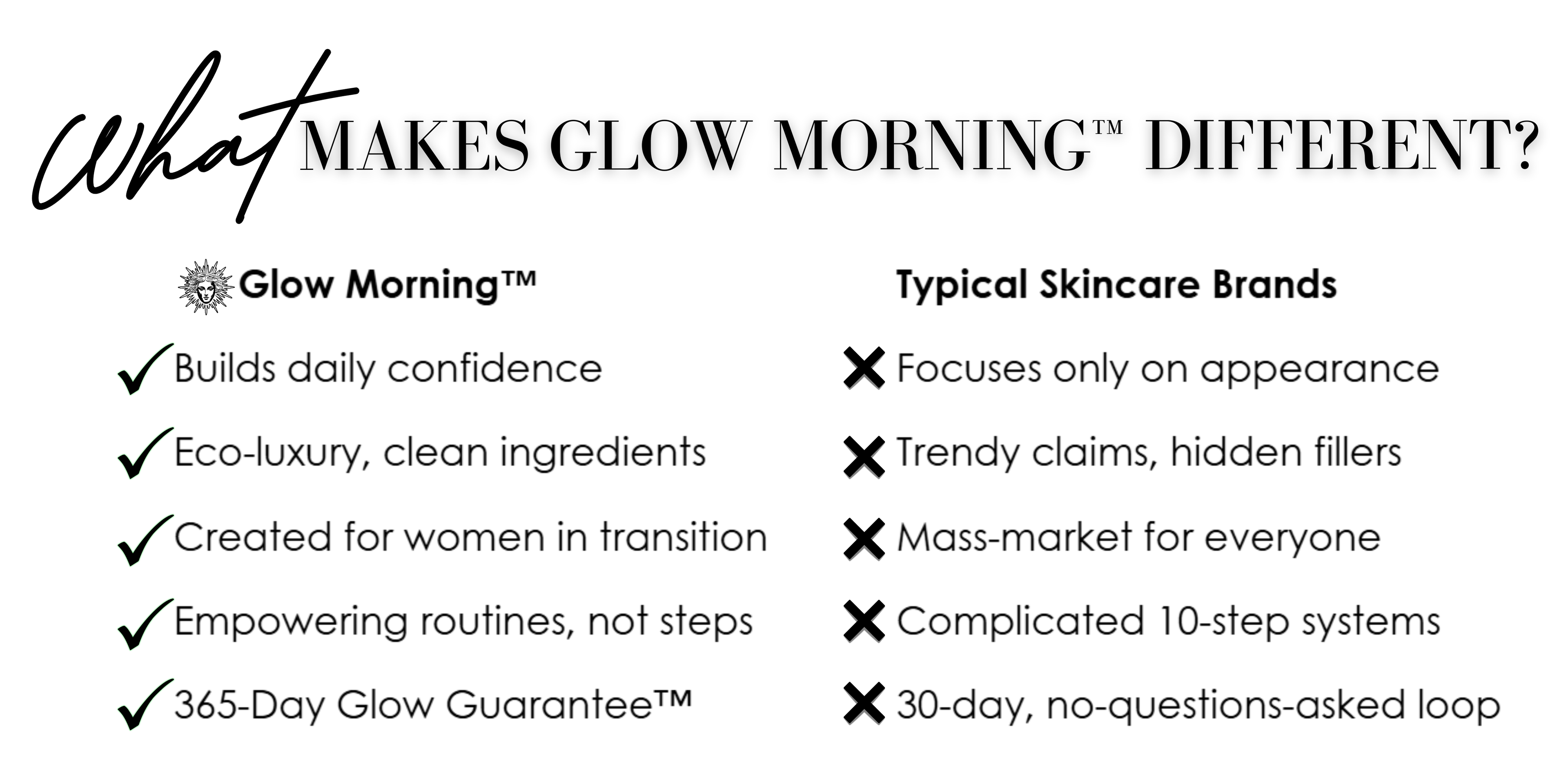 At Glow Morning™, we believe confidence begins the moment you wake up. It’s in that first splash of water, the glow in the mirror, and the feeling of stepping into your day with radiance. The idea was born from a powerful moment—seeing my wife’s face light up after using VitalGlow™, not just from skincare but from self-assurance. As the uplifting scent of orange and bergamot fills the air, and the rich tallow cream melts into every pore, deeply nourishing and restoring radiance, that instant of transformation sparked a movement: skincare that doesn’t just nourish your skin but ignites your confidence. From the first drop of serum to the last touch of moisturizer, Glow Morning™ is more than a routine—it’s your daily ritual of self-love, empowerment, and unstoppable energy. ✨