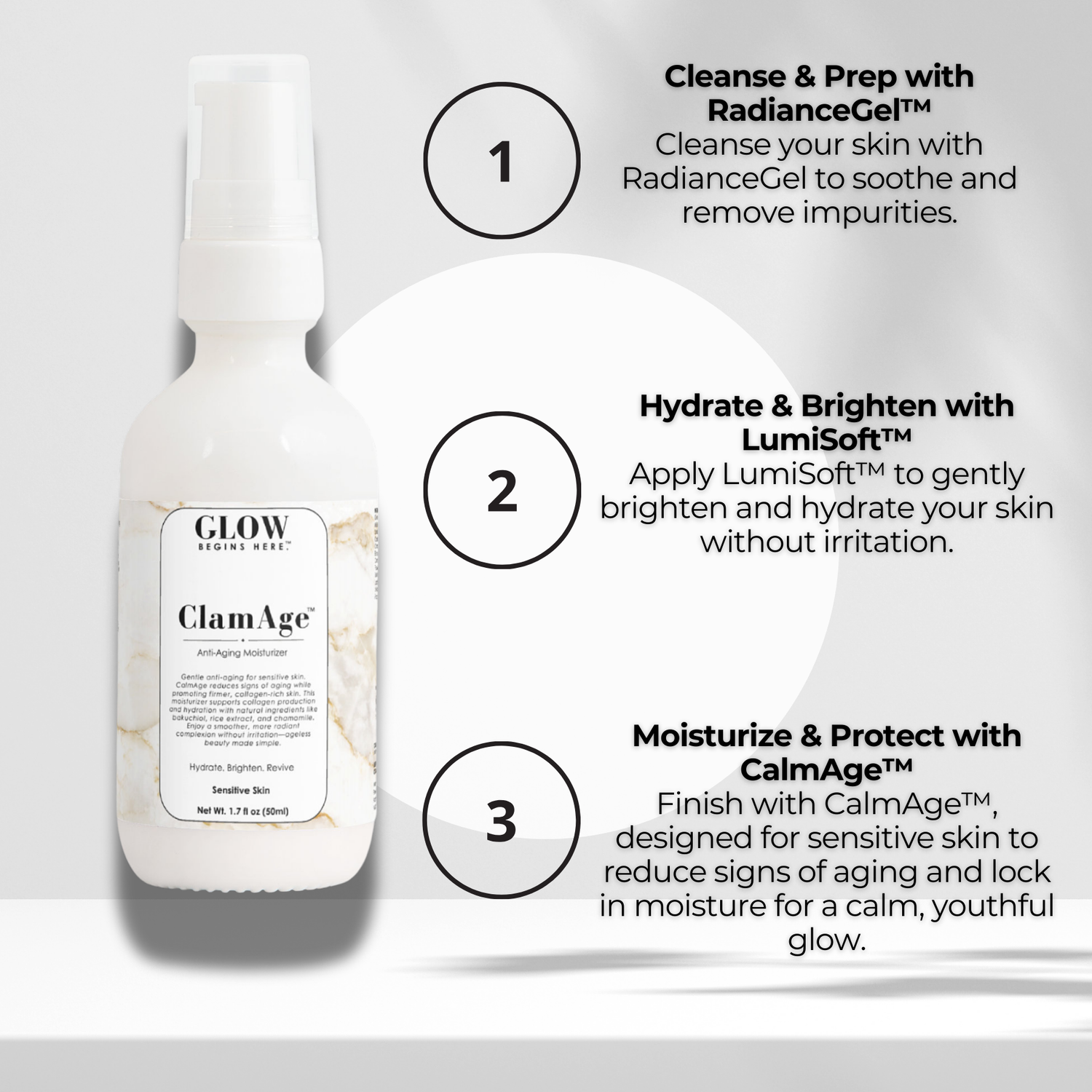"CalmAge™ is the sensitive skin solution to reduce fine lines and boost hydration. Take control of your glow today."
