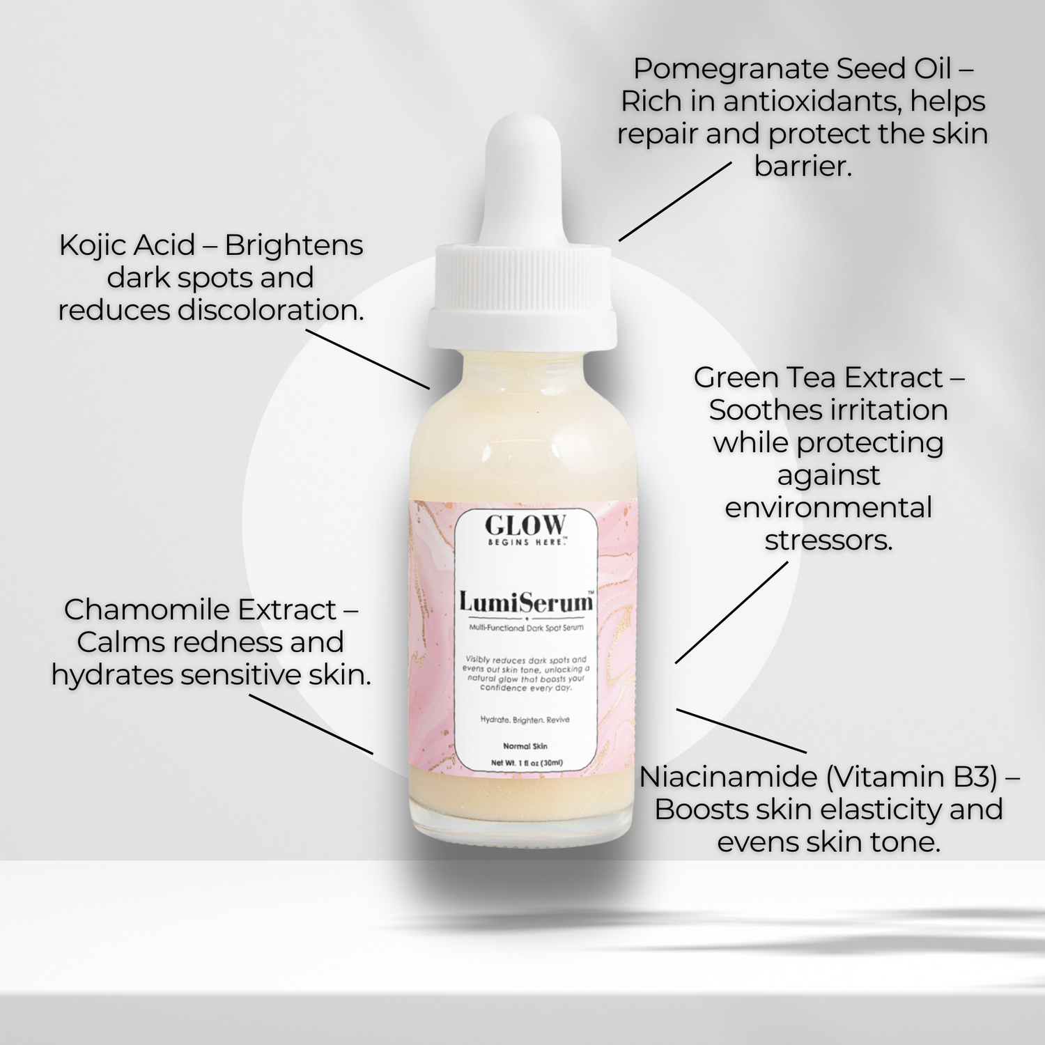 Infused with Kojic Acid and Pomegranate Oil, LumiSerum™ visibly reduces dark spots, hydrates deeply, and protects your skin with soothing botanicals.