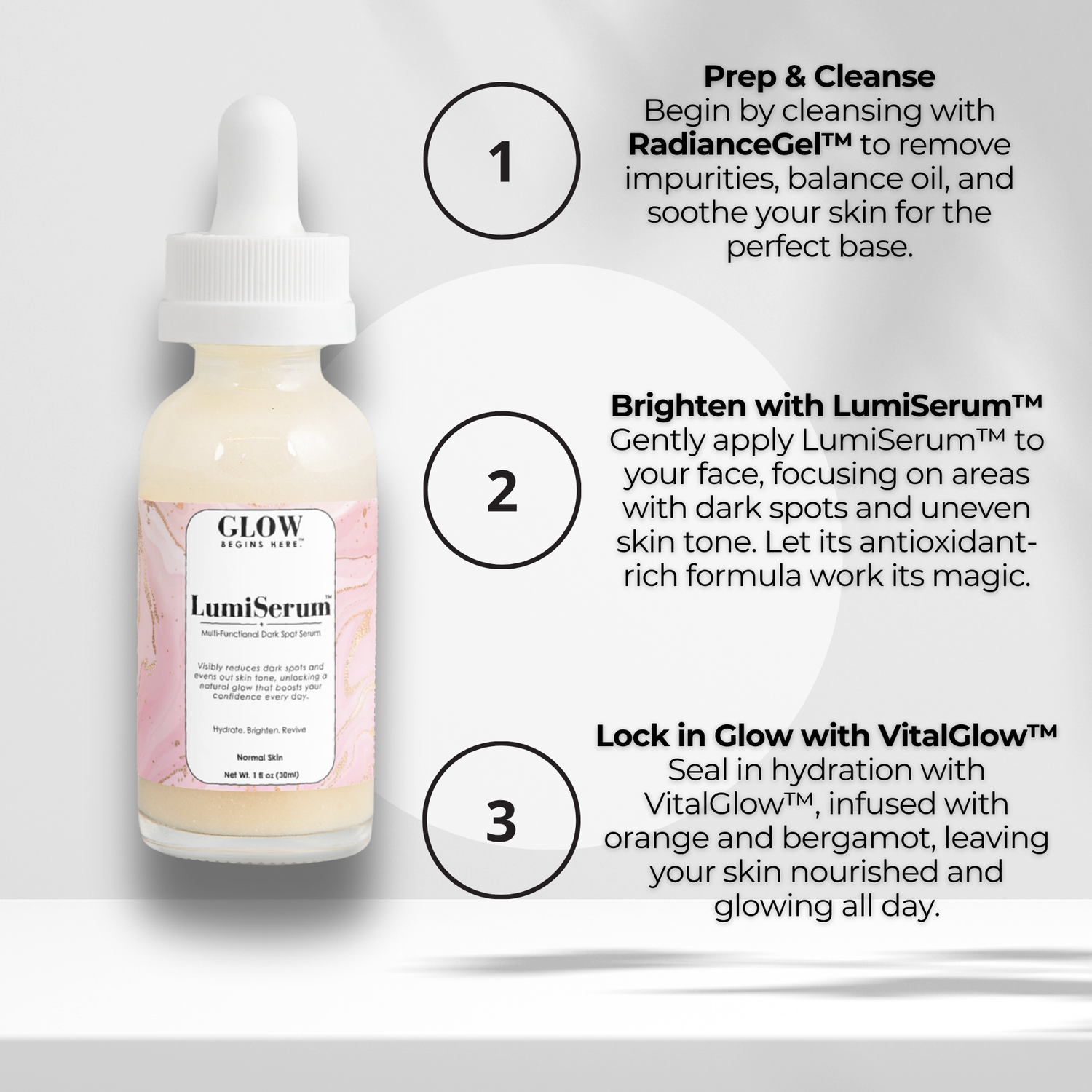 Cleanse, brighten, and lock in moisture with LumiSerum™ — a morning routine designed to reveal radiant, even-toned skin effortlessly.