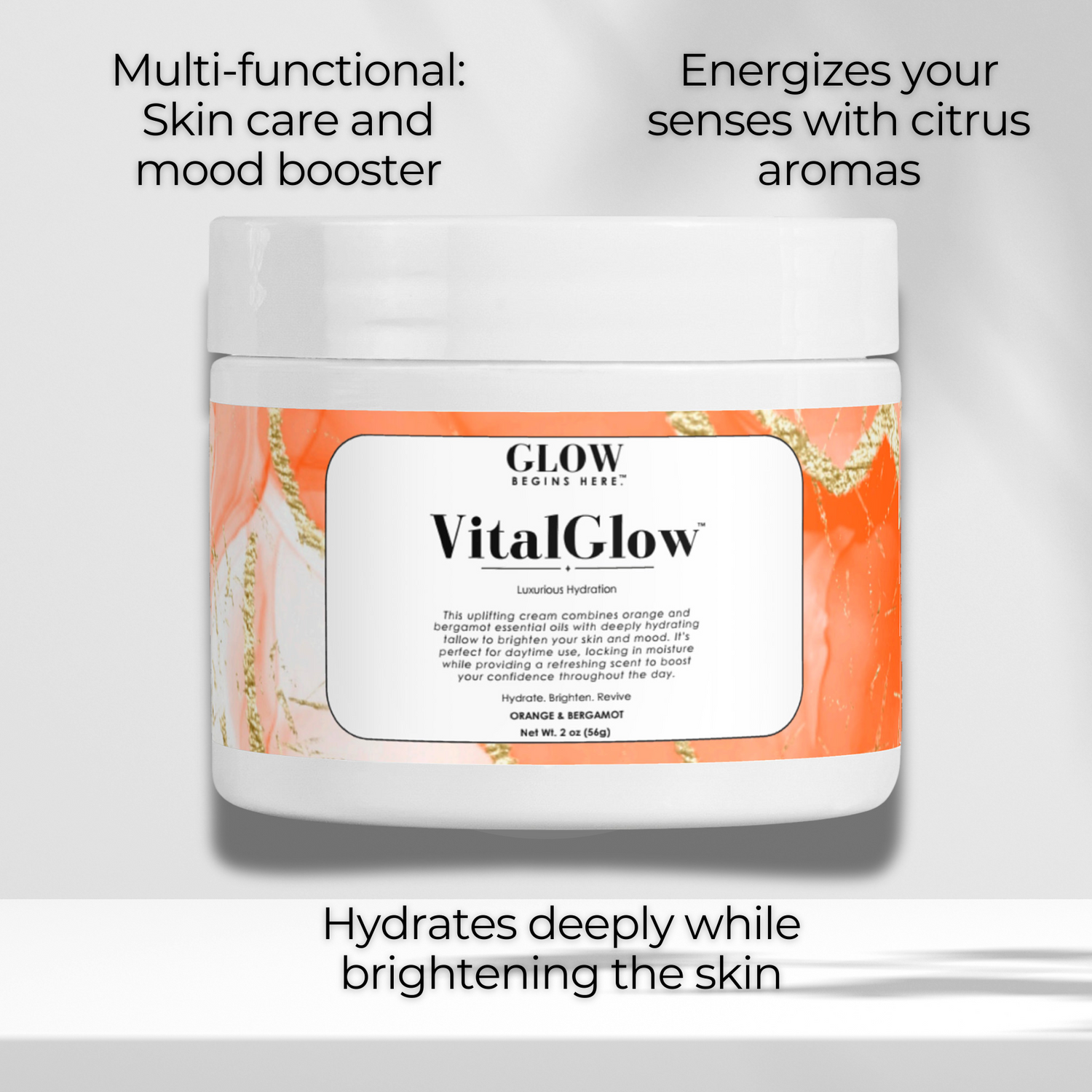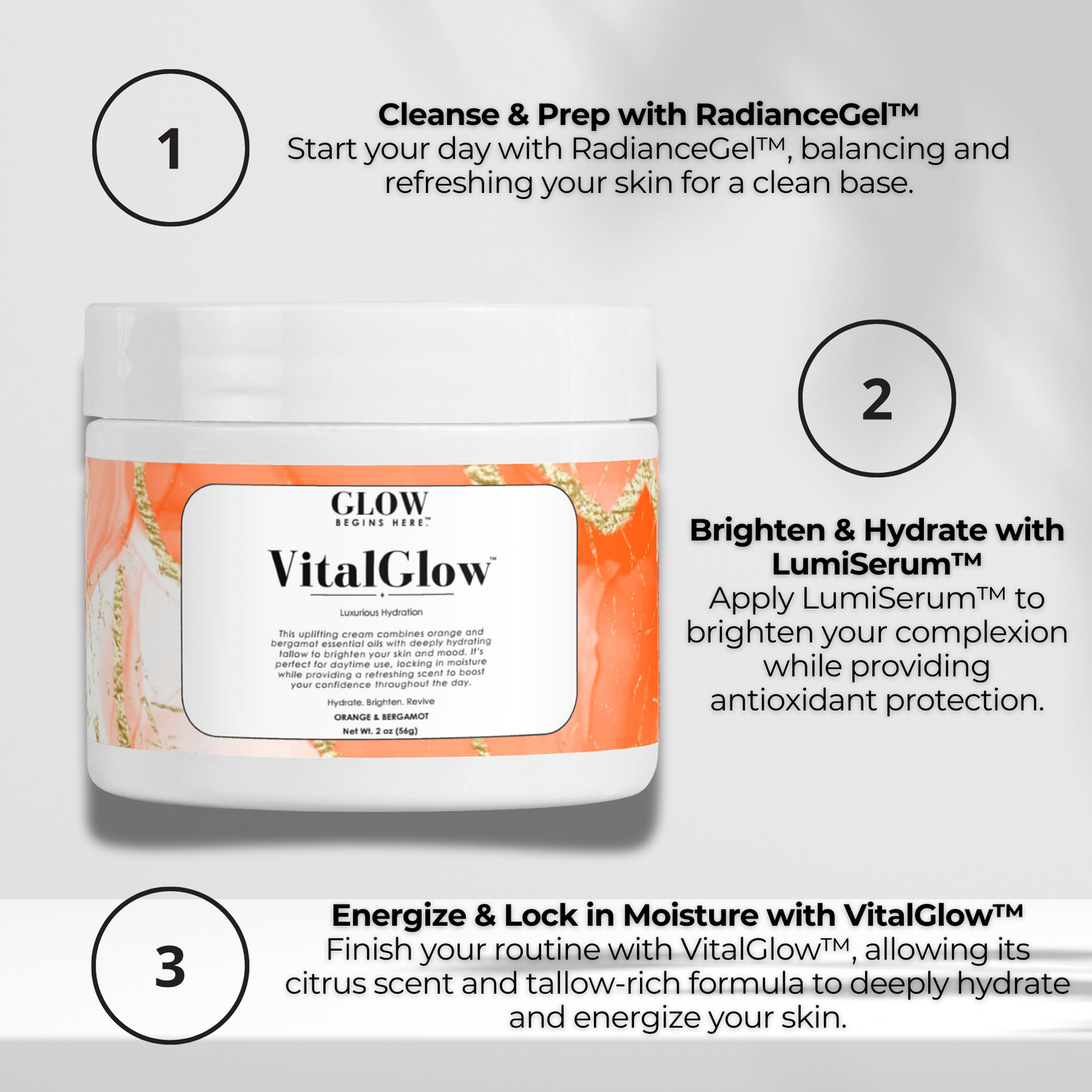 "Brighten your mornings and hydrate deeply with VitalGlow™ energizing citrus formula. Start your journey to radiant skin now."